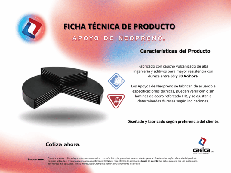 En CAELCA S.A.S. fabricamos y distribuimos diferentes clases de Apoyos de Neopreno a la necesidad y requerimiento de nuestros clientes, según especificaciones o normas indicadas, para sus diversos usos o proyectos.
