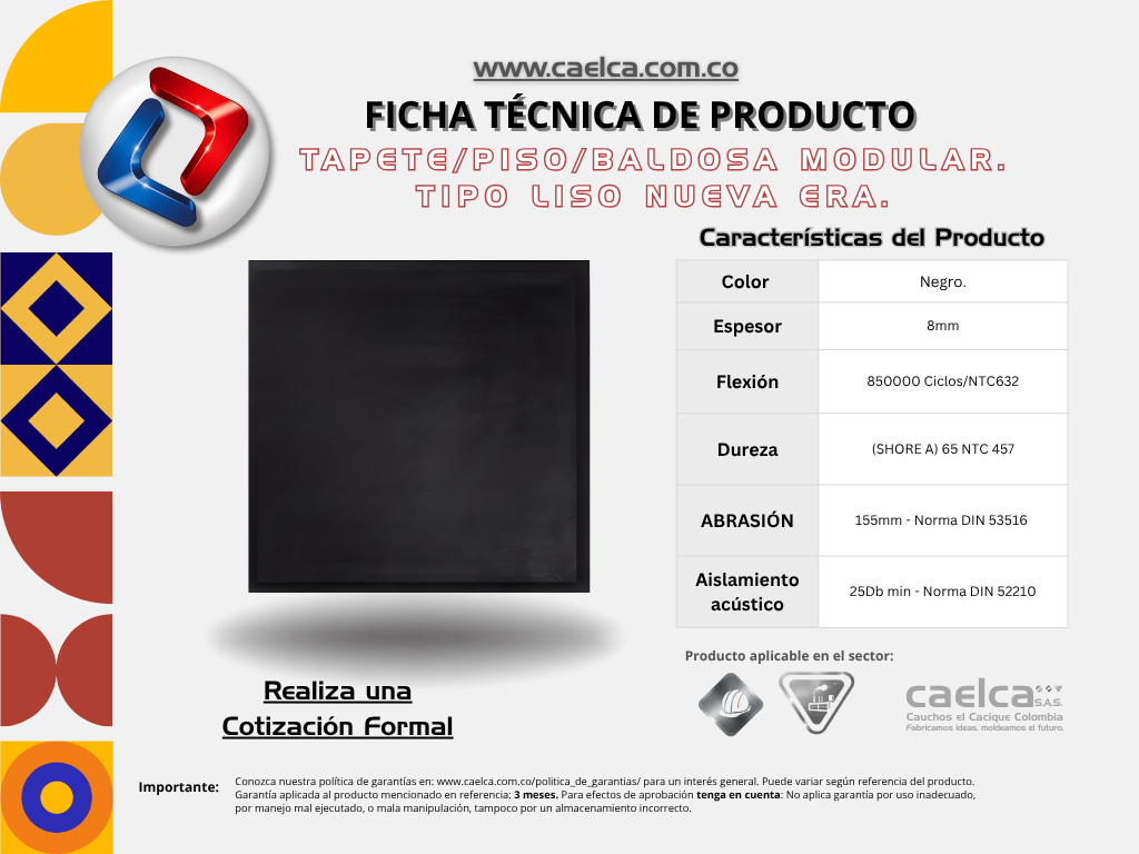La Baldosa modular se encuentra constituida por caucho sintético y natural con aditivos, entre ellos negro de humo y pigmentos para los casos de piso en colores, con alambre en cobre cruzado con cuatro extremos para su conexión a tierra. Es un producto versátil que ofrece muy buena resistencia al impacto y excelente resiliencia lo que permite que el producto, recupere rápidamente su estado inicial después de ser sometido a cargas.
